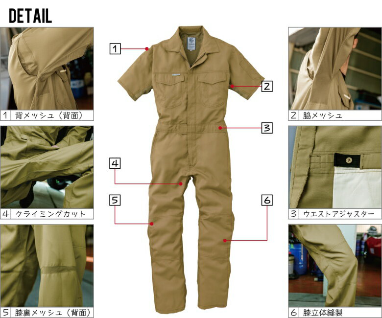 更にウエスト内部のアジャスターや、股のクライミングカット、ひざの3Dカット等、作業性に優れた夏用ツナギに仕立てている。